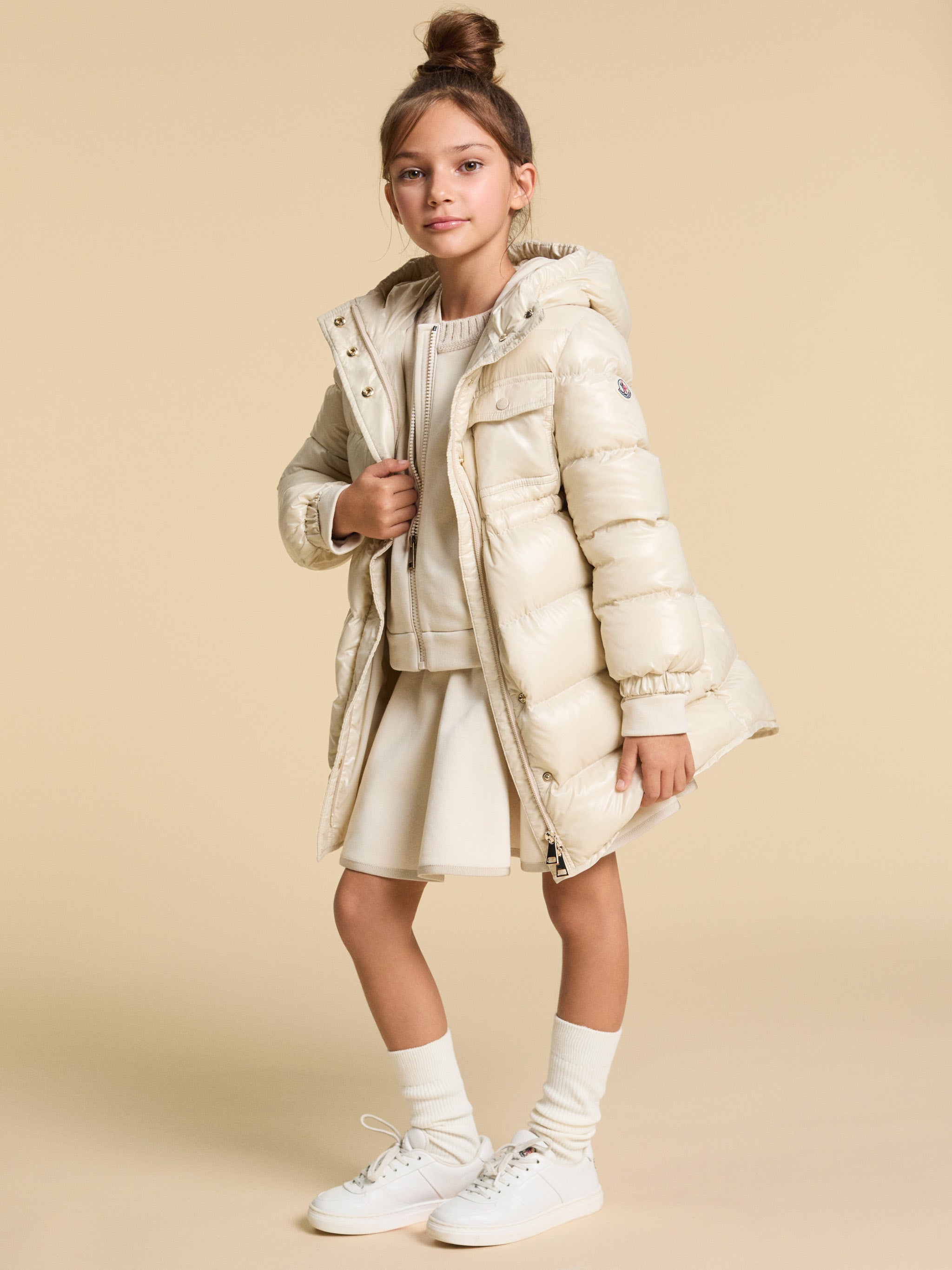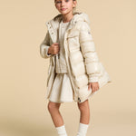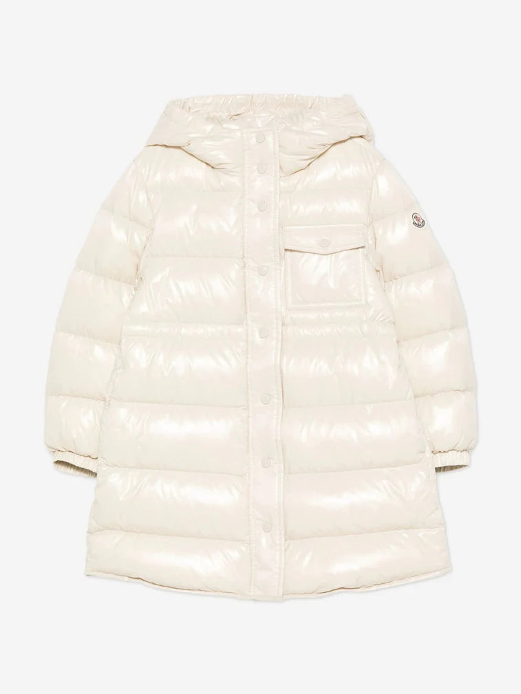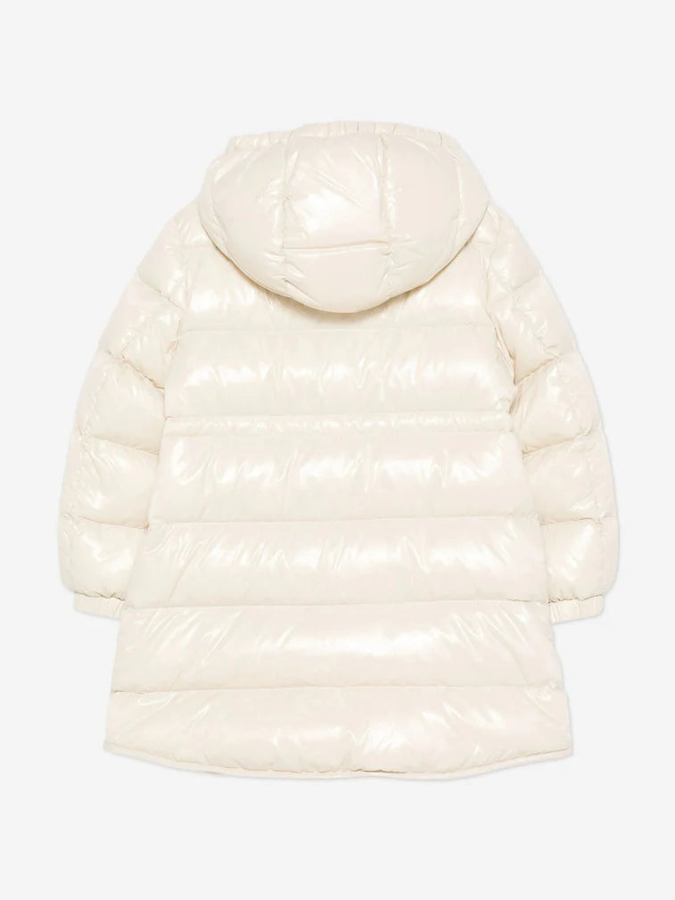 Fun and girly, the Dacca down jacket is crafted from nylon laqué - a breathable down proof fabric with a water-repellent finish. The hooded puffer features an adjustable waistband to allow for freedom of movement during play while a fit and flare shape completes the coat.