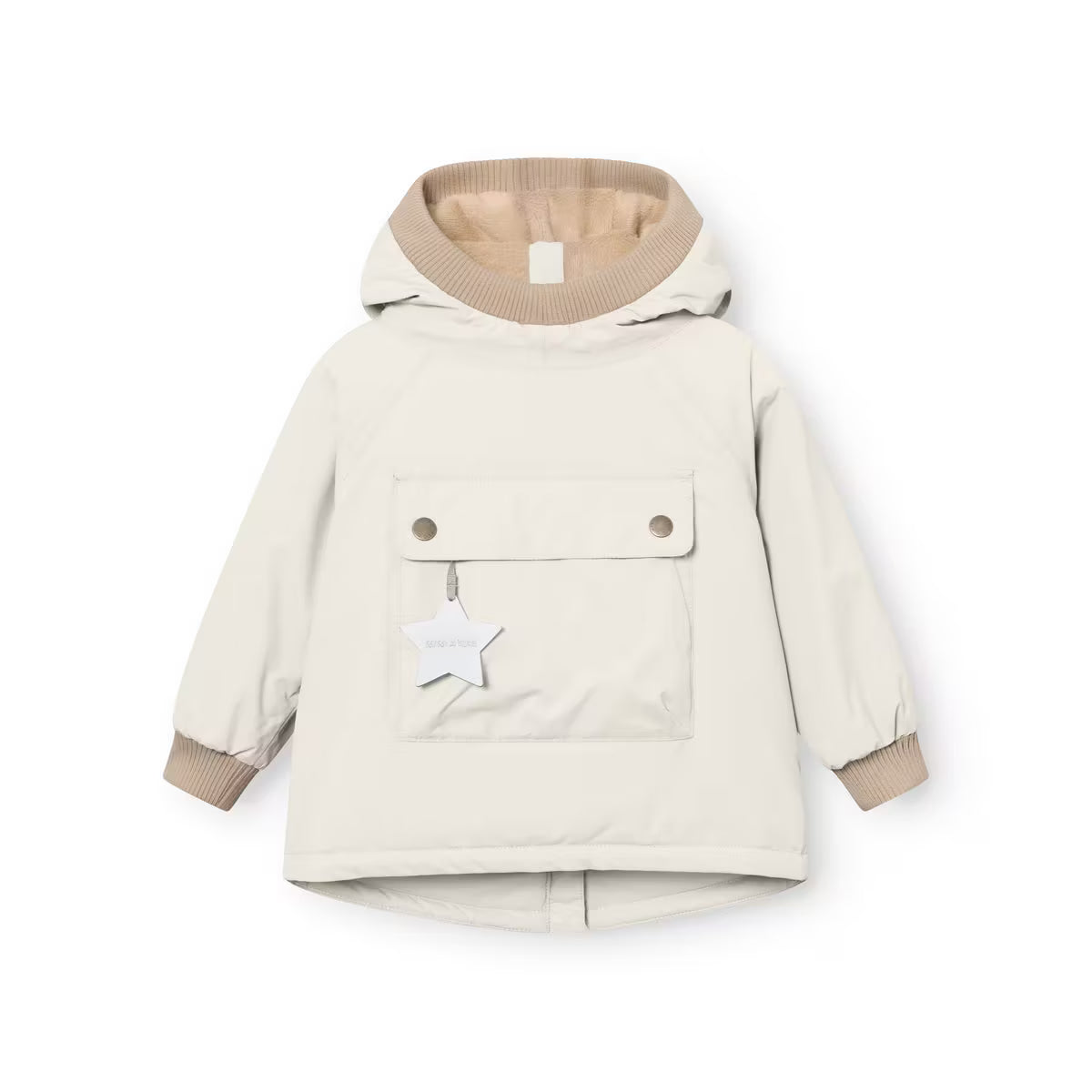 Classic MINI A TURE winter anorak with 10-year guarantee for the smallest children. Wind- and waterproof, breathable, and tested to keep warm down to -25 degrees Celsius. The anorak has a soft rib around the face as well as on the wrists. Large front pocket with snap buttons. The anorak has a soft and warm fleece lining ensuring that the child can keep warm for hours outdoors. The zipper at the back goes all the way up on the hood, making the anorak easy to get on and off even on very small children. MINI A TURE signature reflex star in the pocket.